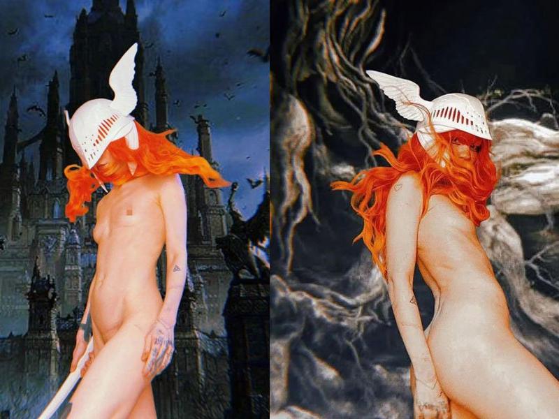 Elder Ring isimli oyundan esinlenen karakterin kostümünü giyen ve tamamen çıplak olarak poz veren Grimes'ın dövmeleri ve turuncu saçı da öne çıktı.