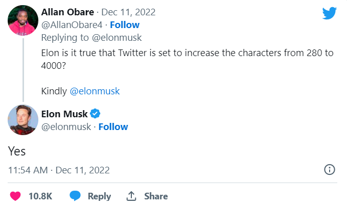 Musk, Allan Obare isimli kullanıcının, "Elon, Twitter'ın karakter sayısını 280'den 4000'e çıkaracağı doğru mu?" sorusuna "Evet" diye yanıt verdi.