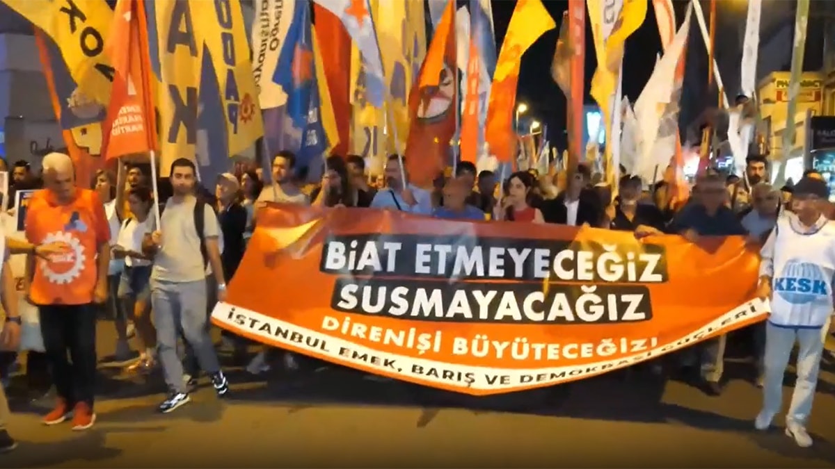“Biat etmeyeceğiz, susmayacağız” yazılı pankart açılan yürüyüşte ayrıca “Gün gelecek, devran dönecek, AKP halka hesap verecek”, “Hırsız, katil AKP” ve “Kurtuluş yok tek başına, ya hep beraber ya hiçbirimiz” sloganları atıldı.