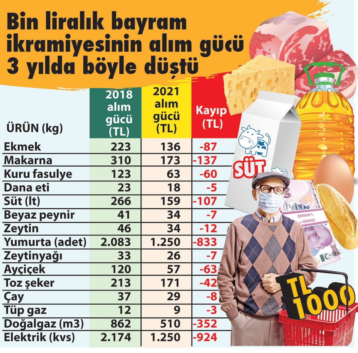 Bayram ikramiyesinin ilk ödendiği Mayıs 2018’de TÜİK hesabıyla ekmeğin kilosu 4.49 lira, doğalgazın metreküpü 1.16 lira, ayçiçek yağı 8.29 lira, süt 3.76 liraydı. Bugün ise ekmek 7.35 lira, doğalgaz 1.96 lira, ayçiçek yağı 17.49 lira ve sütün litresi 6.3 liraya çıktı. 3 yılda ikramiyeden 87 kilo ekmek, 107 litre süt, 63 litre ayçiçek yağı, 352 metreküp doğalgaz kaybedildi.