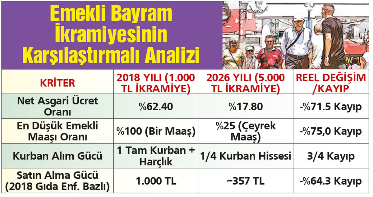 İkramiyenin ilk çıktığı günlerde en düşük emekli maaşı da bin lira civarındaydı. Dolayısıyla ikramiye, en düşük emekli maaşı alan milyonlarca emekli için adeta bir “ilave maaş” niteliği taşıyordu. Bayram ayı geldiğinde emekli, çift maaş almışçasına plan yapabiliyor, biriken borcunu kapatabiliyordu. 2026 yılında en düşük emekli maaşı 20.000 TL iken, 5.000 TL’lik ikramiye maaşın artık sadece dörtte birine (%25) karşılık geliyor. Bir zamanlar “tam bir maaş” olan o bayram sevinci, bugün maaşın yanında bir “küçük katkı payı”na dönüşmüş durumdadır.