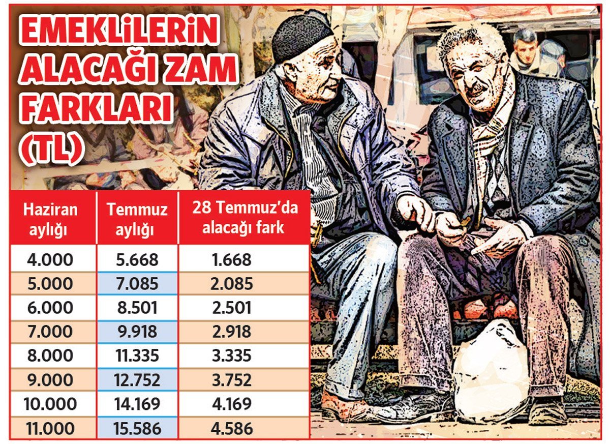 5510 sayılı Kanunun 4/1-(c) (Emekli Sandığı) bendi kapsamında emekli, malul, vazife malulü, dul veya yetim aylığı alan toplam 2.385.799 kişinin 1 Temmuz 2022 tarihinden geçerli olmak üzere aylıklarında oluşan fark tutarları, aylık almakta oldukları Banka ve PTT şubelerindeki hesaplarına gönderilerek 28 Temmuz 2022 tarihinde ödenecek.