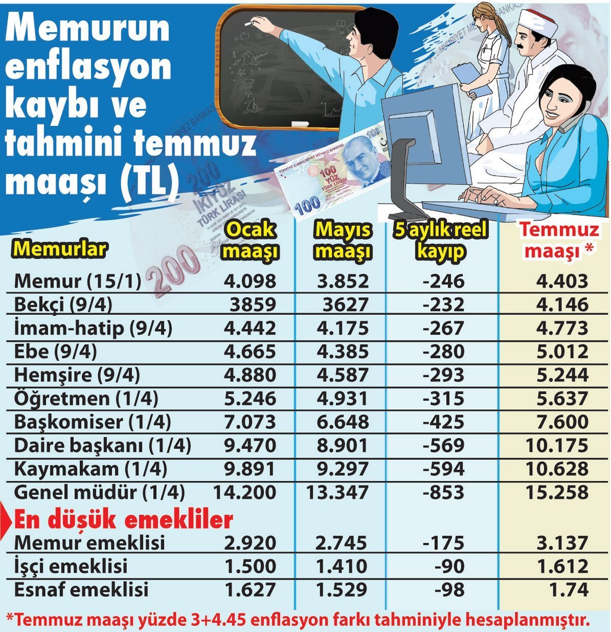 Yılın ilk 5 ayında yüzde 6.39'a ulaşan tüketici enflasyonu, memur ve emeklilere yılın tamamı için verilen yüzde 6'lık maaş zammını tümden silip süpürdüğü gibi milyonlarca dar gelirliyi 3.39 puan eksiye düşürdü. Haziran ayı da dikkate alındığında temmuzda memur ve emeklilere yüzde 3 zammın yanı sıra yüzde 4.45 civarında enflasyon farkı verilecek. Böylece temmuz zammı toplamda yüzde 7.5'e yaklaşacak.
