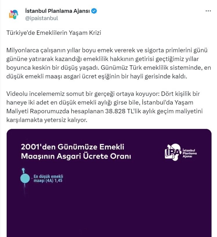 İstanbul Planlama Ajansı (İPA), emekli aylıklarının, 22 yıllık AKP iktidarında yaşadığı düşüşü gösteren bir grafik hazırladı.