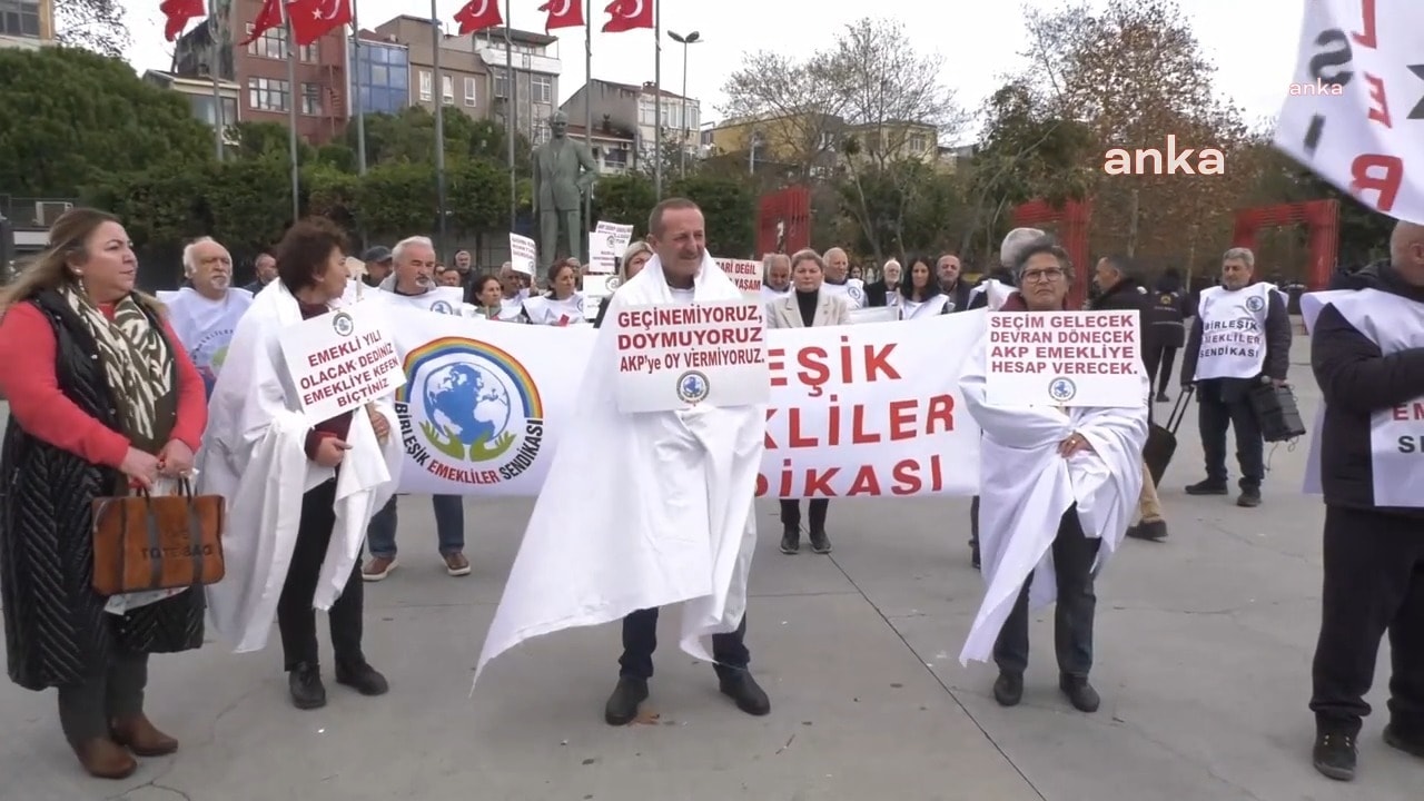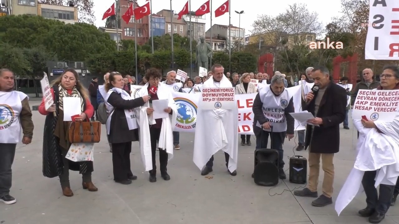 Kefen giyip "Asgari değil insanca yaşam ücreti", "Seçim gelecek, devran dönecek, AKP emekliye hesap verecek", "Geçinemiyoruz, doymuyoruz, AKP'ye oy vermiyoruz", "AKP sebep, emeklinin yoksulluğu sonuçtur", "Emekli yılı olacak dediniz emekliye kefen biçtiniz" yazılı dövizler taşıyan emekliler iktidara kırmızı kart gösterdi. Emekliler adına ortak açıklamayı Birleşik Emekliler Sendikası Genel Sekreteri Aysel Lüle okudu.