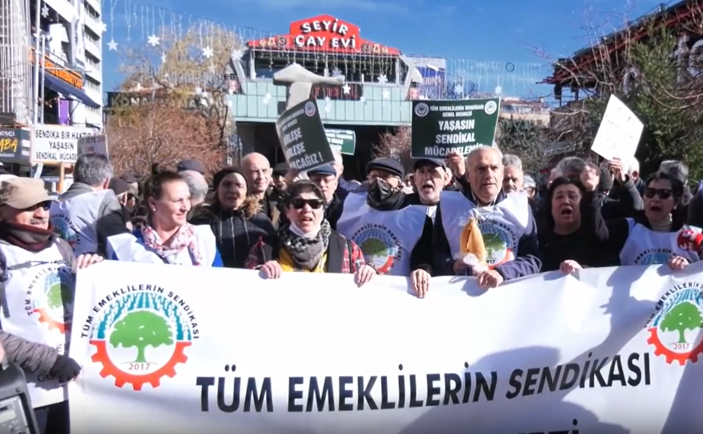Tüm Emeklilerin Sendikası üyesi emekliler, Ankara'da emekli maaşlarını protesto etti. “Sendika ve toplu sözleşme hakkımız engellenemez”, “Yaşasın örgütlü mücadelemiz” dövizleri taşıyan emekliler, “TÜİK, elini cebimizden çek”, “Biz çocuklarımıza onurlu bir gelecek bırakacağız, ya siz”, “Hak, hukuk, adalet” sloganlarını attı.