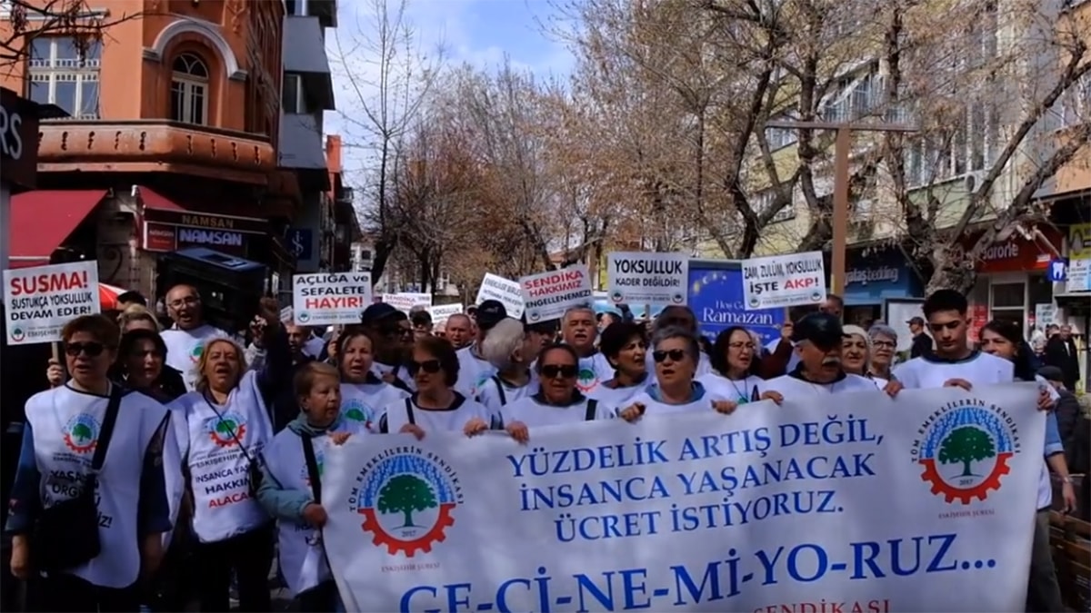 Emeklilere verilen bayram ikramiyesi 3 bin liradan 4 bin liraya çıkarıldı. Açıklanan rakama tepki gösteren emekliler, Eskişehir’de yürüyüş yaptı. Tüm Emeklilerin Sendikası Eskişehir Şubesi’nin çağrısıyla Köprübaşı’nda toplanan emekliler, Hamamyolu Caddesi’ne yürüdü. Çevreden geçen vatandaşların alkışlarla destek verdiği yürüyüşe Et Balık Kurumu’ndan emekli 84 yaşındaki Şerif Yıldırım da destek verdi. Elindeki bastonuyla yürüyüşe katılan Yıldırım, yürümekte zorlanmasına rağmen tüm yürüyüş boyunca pankartın önünde yer aldı.