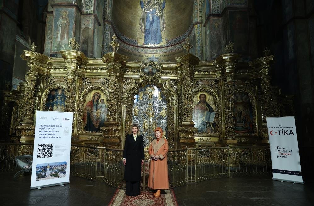 Olena Zelenskiy’nin kültür alanına olan ilgisi ve gerçekleştirdiği projelerin takdire şayan olduğunu ifade eden Emine Erdoğan, geçen yıl İstanbul ziyaretinde Dolmabahçe Sarayı, Efes Antik Kenti ve Kapadokya-Göreme Parkı’nda Ukraynaca sesli rehber hizmetlerinin başladığını birlikte duyurduklarını anımsattı. Bugün de Kiev’deki Aziz Sofya Katedrali’nde Türkçe sesli rehber hizmeti başlatılması vesilesiyle bir arada olduklarını belirten Emine Erdoğan, “Özellikle belirtmek isterim ki Türkçe sesli rehber hizmeti, tamamıyla Sayın Olena’nın tasarrufudur. Kendisine ne kadar teşekkür etsem az. Türk insanına olan bu özel yaklaşımı bizi ziyadesiyle onurlandırdı. Birbirimizin kültür ve tarihini bilmek en başta dostluk köprülerimizin sağlamlaştığının bir ifadesidir” dedi.