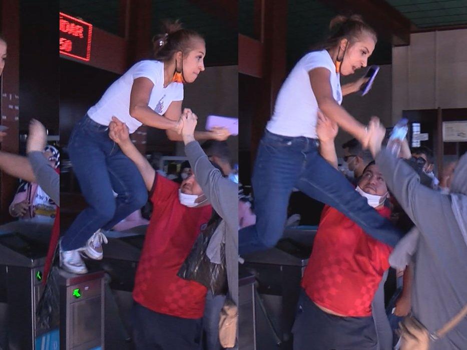 Hızını alamayan kadınlardan biri turnike üzerine çıkarak tartıştığı kadına uçan tekme attı. İskeledeki güvenlik görevlileri kavgayı ayırdı.