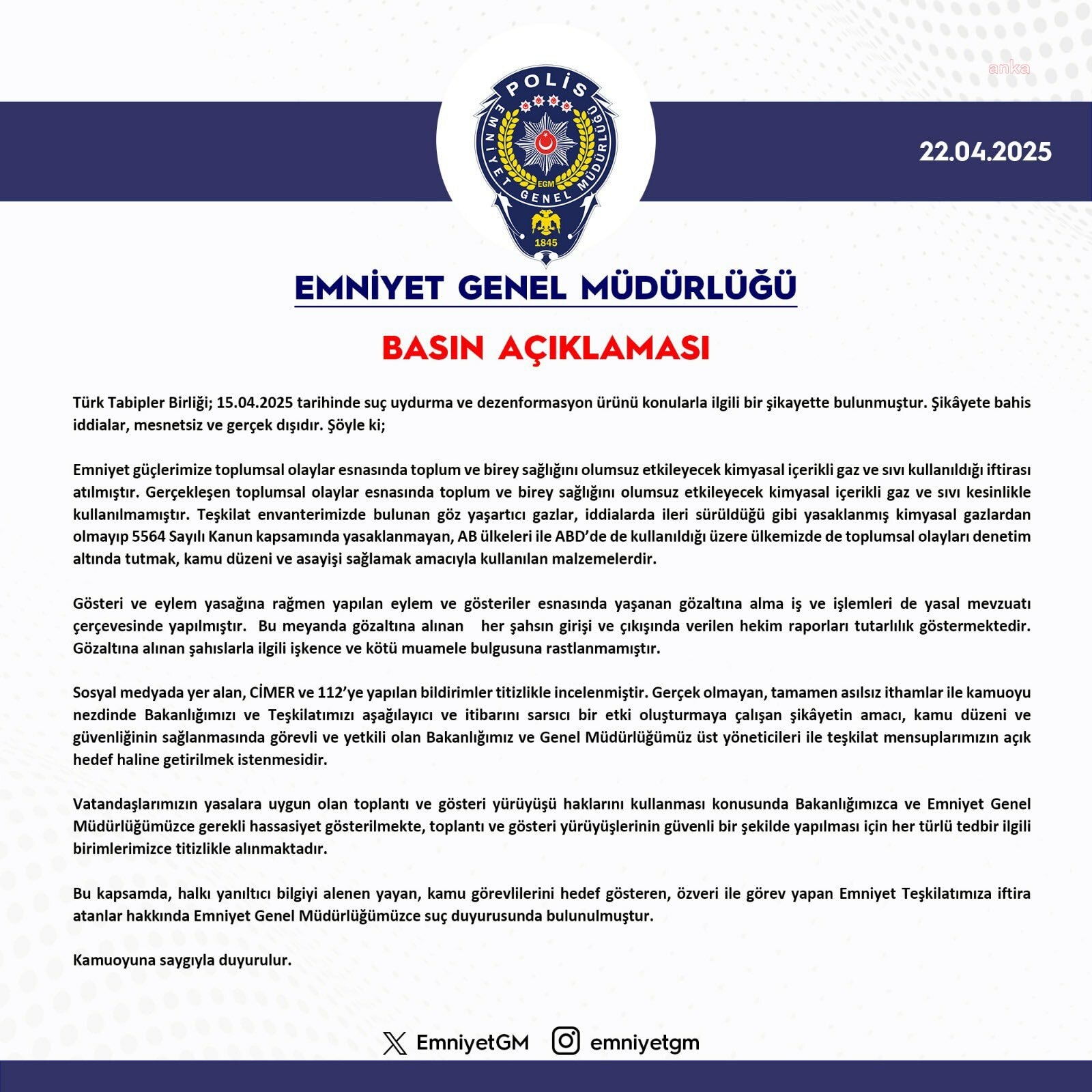 TTB’nin iddialarına ilişkin açıklama Emniyet Genel Müdürlüğü’nün sosyal medya hesaplarından yapıldı. Açıklamada, teşkilatın elinde bulunan göz yaşartıcı gazların, iddia edildiği gibi yasaklı kimyasallar olmadığı, AB ülkeleri ve ABD’de de kullanıldığı belirtildi. Açıklamada şu ifadeler yer aldı: