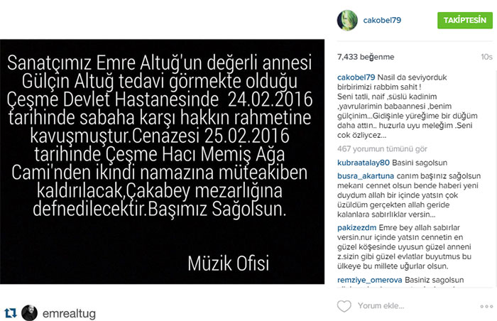 Türk pop müziğinin sevilen ismi Emre Altuğ'un Çeşme Devlet Hastanesi'nde yatan annesi Gülçin Altuğ sabah saatlerine yakın vefat etti. Emre Altuğ sosyal medyadan acı haberi duyurdu. Çağla Şıkel'de Emre Altuğ'un paylaşımını, kendi sayfasında paylaştı ve duygusal bir not yazdı.