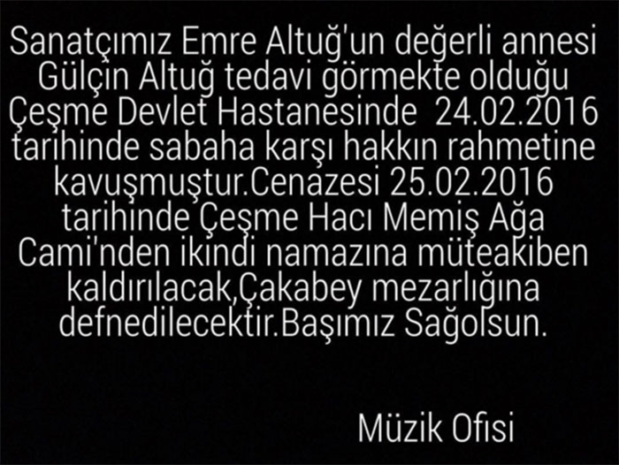 Sanatçımız Emre Altuğ'un değerli annesi Gülçin Altuğ tedavi görmekte olduğu Çeşme Devlet Hastanesi'nde 24 Şubat 2016 tarihinde sabaha karşı hakkın rahmetine kavuşmuştur. Cenazesi 25 Şubat 2016 tarihinde Çeşme Hacı Memiş Ağa Camii'nde ikindi namazına müteakiben kaldırılacak, Çakabey mezarlığına defnedilecektir. Başımız sağolsun.