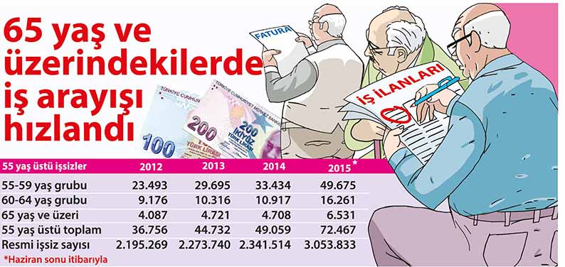 Bu sayı 2012 yılı Haziran ayında 4 bin 87 oldu, 2014 yılı Haziran ayında da 4 bin 708’e kadar çıktı. Ancak bu yıl haziran sonuna gelindiğinde iş arayan 65 yaş ve üzerindeki işsiz sayısı, geçmiş yıllara göre olağanüstü artışla bir anda 5 bin sınırını da aştı, 6 bin 531’e ulaştı. Üstelik, yaşlı işsiz sayısındaki patlama 65 yaş üstü vatandaşlarla da sınırlı kalmadı. Aynı dönemde 60-64 yaş arası gruptaki işsiz sayısı 10 bin 917’den 16 bin 261 bine; 55-59 yaş grubundaki işsiz sayısı da 33 bin 434’ten 49 bin 675’e çıktı. Toplamda 55 yaş ve üzerindeki işsiz sayısı son bir yılda yüzde 47.7 artarak 49 binden 72 bin 467’ye fırladı. Oysa aynı dönemde toplam işsiz sayısındaki artış yüzde 30.4 oldu. Veriler, yaşlı nüfusun, son dönemde çalışma çağındaki nüfustan çok daha fazla iş aramaya başladığını işaret ediyor.