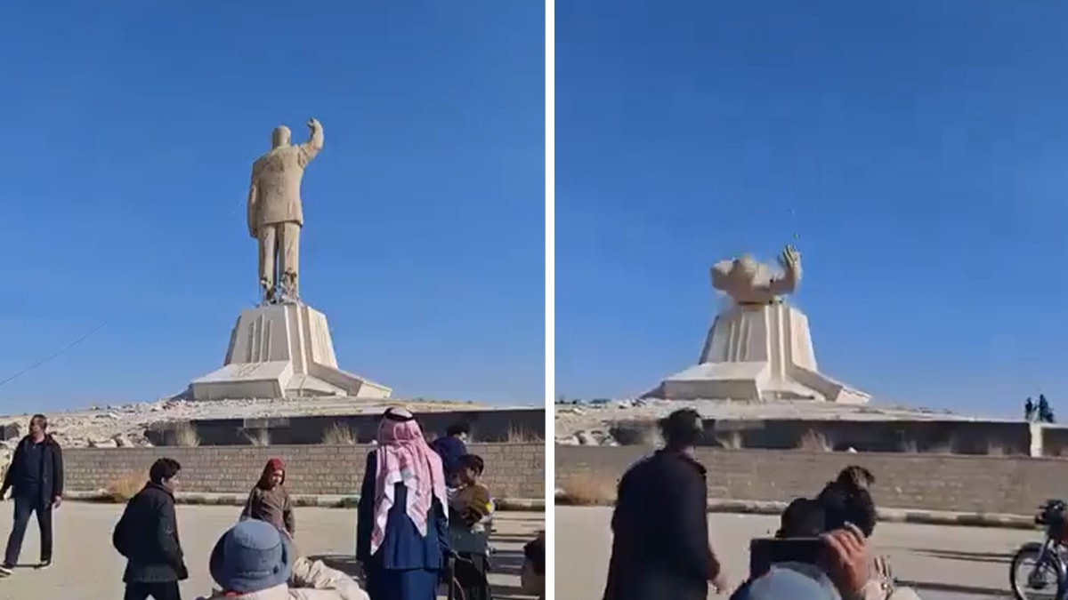 Görüntülerde, Baba Esad heykeli moloz yığınına dönüşürken onlarca kişinin tezahürat yaparak öne atıldığı ve kutlama amacıyla kalıntıların üzerine tırmandığı görüldü.