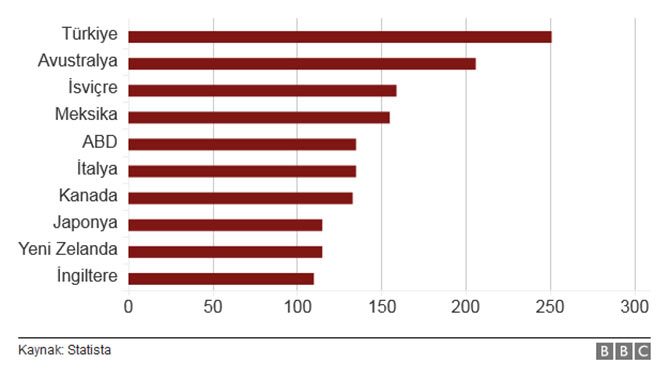 Perşembe günü kapanışında ise Dolar/TL kuru 2,84 seviyesindeydi. Eğer hesaplama o kur üzerinden yapılmış olsaydı Türkiye'deki pasaport bedeli, ikinci sıradaki Avustralya gibi 206 dolar olacaktı. BBC Turkçe