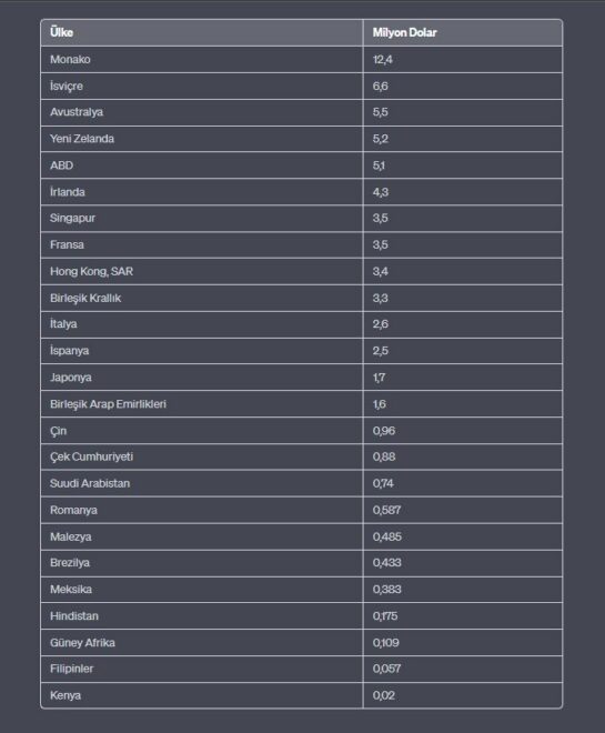Birleşik Krallık'ta 3,3 milyon dolar, BAE'de 1,6 milyon dolar ve Çin'de 960 bin dolara sahip olanlar ülkenin en zengin yüzde 1'lik kısmına dahil olabiliyor.