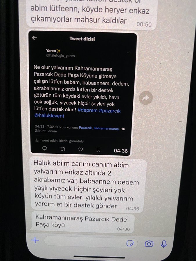 "Lütfen yardım gönderin. Tek bir Allah'ın kulu gelmedi. Hiçbir vinç yok, hiçbir alet çalışmıyor. Elbistan'da taş üstünde taş kalmadı.  Allah rızası için bebeklere bez, mama, süt. Ekmek, ekmek bile yok. Yardım edin Allah rızası için. Yetişin, burada hiç kimsenin, hiçbir şeye gücü yetmiyor."