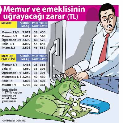 2013 yılında imzalanmış bir toplu sözleşmenin “bozulması” anlamına da gelen memur ve emeklilerin aleyhindeki bu değişiklik nedeniyle halen 2 bin 29 lira maaş alan en düşük dereceli memurun aylık enflasyon farkı kaybı 38 lira, yıllık kaybı ise 456 lirayı bulacak. Toplu sözleşmeyle yapılan bu oyun polis memurunun yıllık 648 lira, öğretmenin 576 lira gelir kaybına uğramasına neden olacak. Aynı şekilde öğretmen emeklisi 396 lira, memur emeklisi 336 lira, müdür emeklisi 384 lira yıllık gelirden olacak.