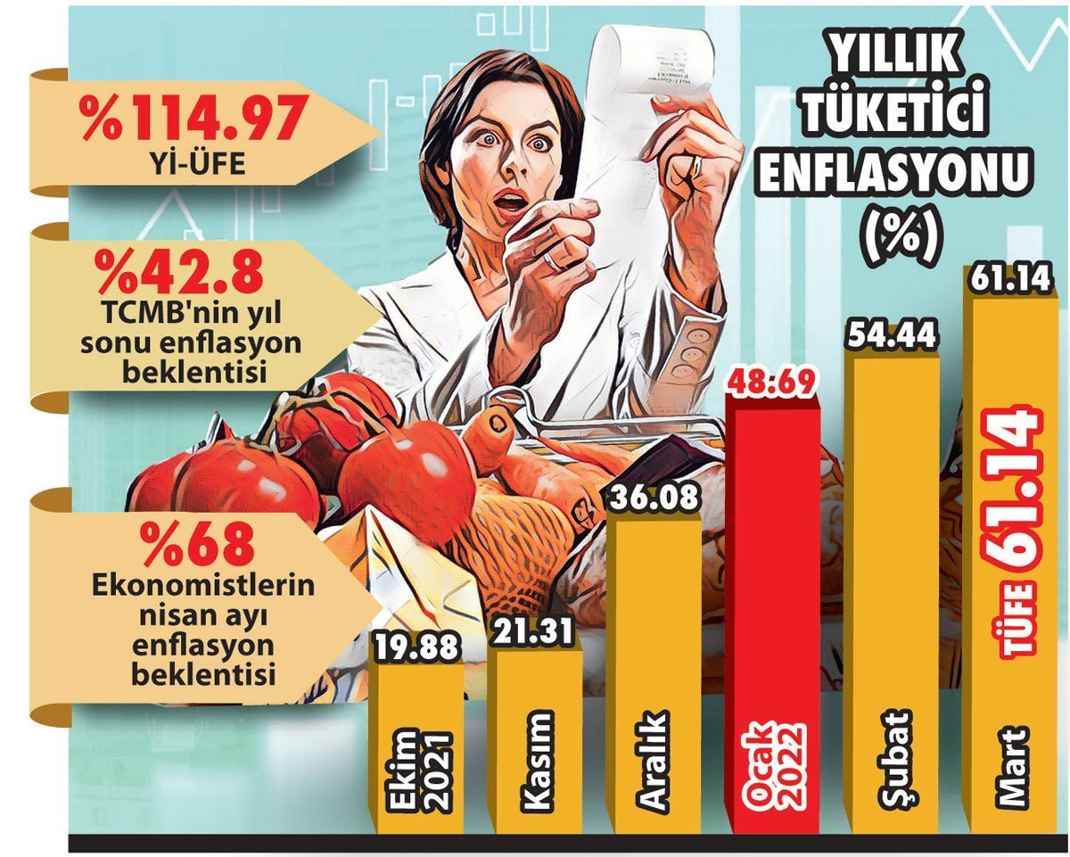 Rusya-Ukrayna savaşı sebebiyle artan emtia fiyatlarının ekonomiye etkisini yansıtır şekilde, Merkez Bankası (TCMB) yılın ikinci enflasyon raporunda yıl sonu enflasyon tahminini neredeyse iki katına çıkararak 2022 sonu enflasyon orta nokta tahminini %42.8 olarak belirledi. Enflasyon raporunda TCMB tarafından paylaşılan grafiklere göre enflasyonun zirveyi bu yıl yaklaşık %70 seviyelerinde görmesi ardından düşüşe geçmesi bekleniyor. Kavcıoğlu da Mayıs ayı ardından enflasyonda düşüş başlayacağını belirtti. Mart ayında yıllık enflasyon TL'deki birikimli değer kaybının etkisiyle gıda ve ulaştırma kalemleri öncülüğünde beklentilerin de üzerinde %61.14'e yükselmişti. Ankette yıl sonu enflasyon tahminlerinin medyanı %52 olarak gerçekleşti. Hükümet düşük faiz ile üretim ve ihracatı destekleyen bir ekonomi programı uygulayarak kronik cari açığı fazlaya çevirdikten sonra enflasyon ile mücadele etmeyi hedefliyor. Fakat Rusya-Ukrayna savaşı sebebiyle yükselen enerji faturası ve döviz getirici turizm sektörü riskleri Türkiye'nin programını tehlikeye sokabilir. Enflasyonun hanehalkı bütçesine etkisini azaltmak için hükümet temel gıdalarda katma değer vergisi indirimi uygulamış, belirli tüketici gruplarının enerji faturalarının bir kısmına destek açıklamıştı. Türkiye İşçi Sendikaları Konfederasyonu (Türk-İş), Ankara'da hesaplanan gıda enflasyonunun KDV indirimine rağmen Nisan'da bir önceki aya göre %8.02 arttığını; dört kişilik bir ailenin yoksulluk sınırının ise ilk kez 17,000 TL'yi aştığını açıkladı.