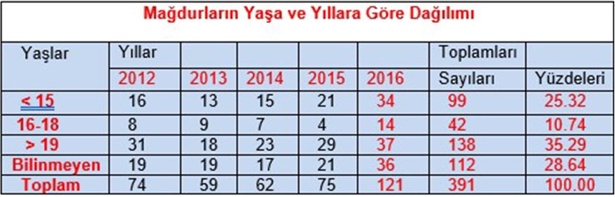 Toplumsal Haklar ve Araştırmalar Derneği (TOHAD)’ın 2016 yılında hazırladığı Engelli Bireylere Yönelik Fiziksel Cinsel Şiddet, İstismar ve Kötü Muamele Olayları İzleme Raporu’ndaki verilerden örnek veren Pedagog Ebru Şen, “Tablo incelendiğinde 99’u (yüzde 25,32) 15 yaşın altında, 42’si (yüzde10,74) ise 16-18 aralığına olmak üzere toplam 141 engelli çocuk, fiziksel/cinsel saldırı ve kötü muamele mağduru olmuştur.” dedi.