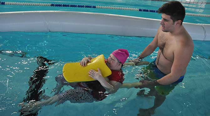 9 hafta sürecek eğitimlerde zihinsel ve bedensel engeli bulunanlara temel yüzme eğitimi veriliyor. Foto: DHAKütahya'daki Dumlupınar Üniversitesi (DPÜ) Beden Eğitimi ve Spor Yüksekokulu son sınıf öğrencisi Yaşar Güngör de engellilere bu imkanları sağlamak için , 'Topluma hizmet uygulamaları' dersi kapsamında bedensel ve zihinsel engellilere kampüs içerisindeki olimpik havuzda yüzme eğitimi veriyor.