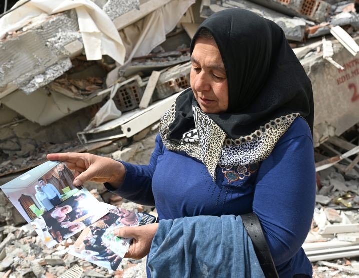 Ulu Cami Mahallesi'nde depremde yıkılan beş katlı binada oğlu ve üç torununu kaybeden Aysel Ekici de enkazda yitirdiği yakınlarından geriye kalan eşyaları aradı.