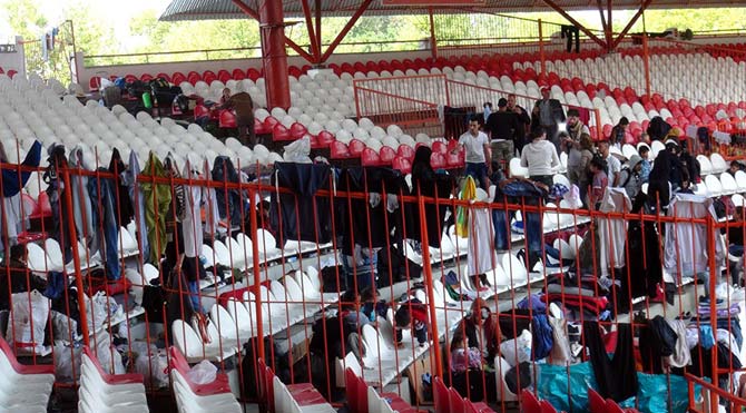 Avrupa'nın çeşitli ülkelerine karayolundan yürüyerek gitmek için bekleyen Suriyeli mültecilerin 7'nci günde bekleyişleri sürüyor. Mülteciler dün gece etkili olan sağanak yağmurda kartondan ve poşetlerden yaptıkları çadırları kullanılmaz hale geldiğinden geceyi Er Meydanı'ndaki soyunma odaları ve tribündeki koltukların arasında geçirdi. Sabah kalkıp tekrar yeşillik alana çadırlarını kurup ateş yakıp ısınmaya çalışan sığınmacılar, kahvaltı almak için uzun kuyruklar oluşturdu. Buldukları demir parmaklıklara ıslak çamaşırlarını asan Suriyeli sığınmacılar bugün BM toplantısından kendileri için olumlu haber çıkmasını ümit ediyor.