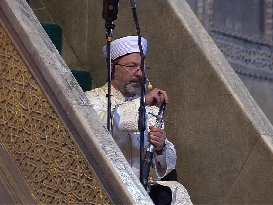 Erbaş hutbede milletin Ayasofya hasretinin sona erdiğine dikkat çekerek, "Bugün Ayasofya kubbelerinde yeniden tekbir ve salavatların yankılandığı, minarelerinden ezan ve selaların yükseldiği gündür. Bugün bundan 70 sene önce hemen karşımızdaki Sultan Ahmet Camii minarelerinin 16 şerefesinden 16 müezzinin Allahuekber sedalarıyla yeri göğü inlettiği, 18 yıl ayrılıktan sonra minarelerimizin ezanlara kavuştuğu anın bir benzerini yaşadığımız gündür. Bugün müminlerin sevinç gözyaşları içinde kıyama durduğu, huşu ile rükuya vardığı ve şükürle secdeye kapandığı gündür.