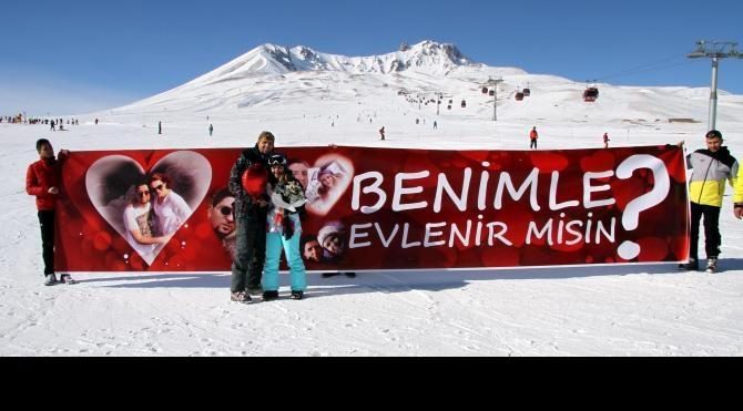 Yasin DALKILIÇ/ KAYSERİ,(DHA)– KAYSERİ'de bir hastanede görevli Süleyman Aslantaş (28), 2 yıldır görüştüğü Doktor Figen Ertan’a (28) Erciyes Kayak Merkezi'nde pankart, çicek ve yüzükle sürpriz bir evlilik teklifi yaptı. Evlilik teklifinin ardından çift, müzik eşliğinde kayak pistinde dans etti.