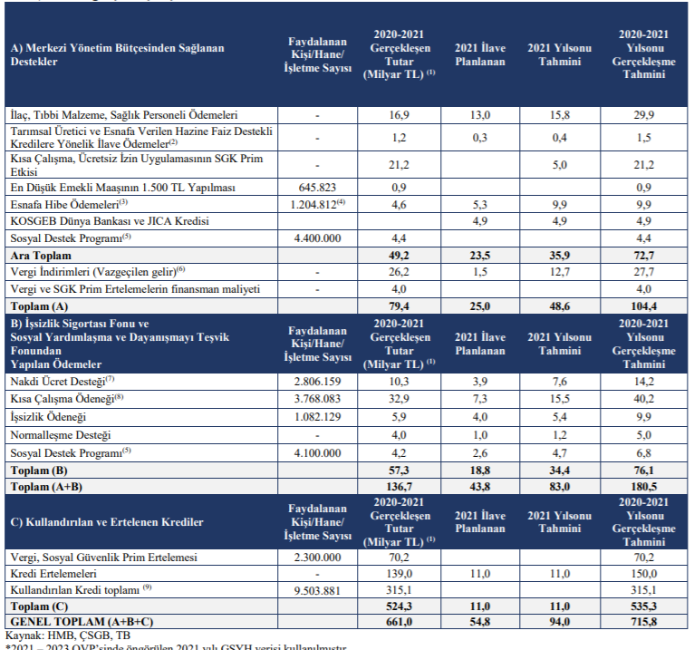 Tarımsal üretici ve esnafa verilen hazine faiz destekli kredilere yönelik ilave ödemelerin 1,2 milyar TL olduğu, kısa çalışma, ücretsiz izin uygulamasının SGK prim etkisinin de 21,2 milyar TL olduğu belirtildi. Bunlar da salgın desteklerine eklendi.