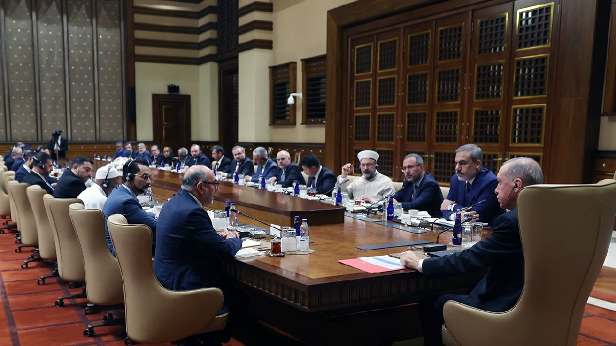 Görüşmede Cumhurbaşkanı Erdoğan'a, Dışişleri Bakanı Hakan Fidan, Cumhurbaşkanı Başdanışmanı Büyükelçi Akif Çağatay Kılıç, Diyanet İşleri Başkanı Ali Erbaş ve diğer ilgililer eşlik etti. (AA)