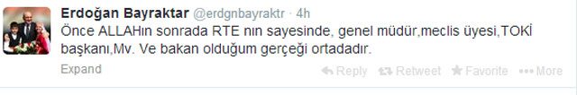 Bayraktar günler sonra ilk kez bir mesaj yayınladı ve "Önce Allah'ın sonrada RTE'nin sayesinde, Genel Müdür, Meclis üyesi, TOKİ Başkanı, milletvekili ve bakan olduğum gerçeği ortadadır" dedi.