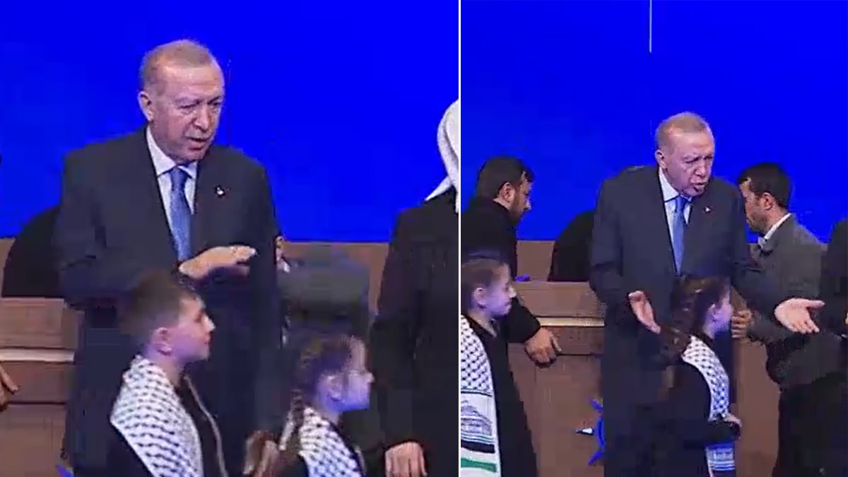 Cumhurbaşkanı Erdoğan, sahneye çocukların gelmesinin ardından sahnenin altında bulunan birini azarladı. Erdoğan'ın çocukları işaret ettiği ve sinirlendiği görüldü.