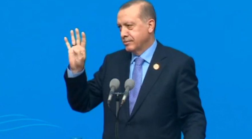 Erdoğan bir Çinli gazetecinin bölgesel sorunlarla ilgili bir sorusuna da Rabia işareti ile (tek millet, tek bayrak, tek vatan, tek devlet) yanıt verdi.
