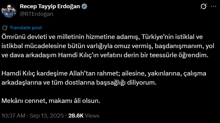 Cumhurbaşkanı Recep Tayyip Erdoğan, uzun yıllardır konuşma metinlerini hazırlayan ve Cumhurbaşkanlığı Başdanışmanı olarak görev yapan Hamdi Kılıç’ın vefatı üzerine sosyal medya hesabından taziye mesajı yayımladı.