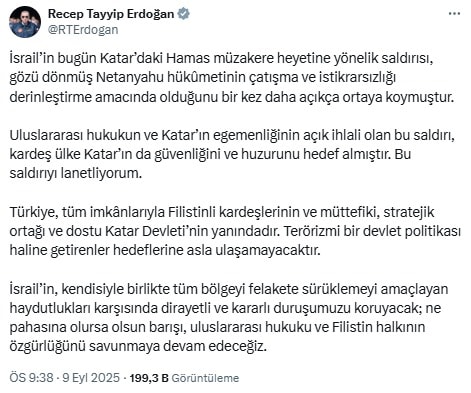 "İsrail'in bugün Katar'daki Hamas müzakere heyetine yönelik saldırısı, gözü dönmüş Netanyahu hükümetinin çatışma ve istikrarsızlığı derinleştirme amacında olduğunu bir kez daha açıkça ortaya koymuştur. Uluslararası hukukun ve Katar'ın egemenliğinin açık ihlali olan bu saldırı, kardeş ülke Katar'ın da güvenliğini ve huzurunu hedef almıştır. Bu saldırıyı lanetliyorum. Türkiye, tüm imkanlarıyla Filistinli kardeşlerinin ve müttefiki, stratejik ortağı ve dostu Katar Devleti'nin yanındadır. Terörizmi devlet politikası haline getirenler hedeflerine asla ulaşamayacaktır. İsrail'in, kendisiyle birlikte tüm bölgeyi felakete sürüklemeyi amaçlayan haydutlukları karşısında dirayetli ve kararlı duruşumuzu koruyacak, ne pahasına olursa olsun barışı, uluslararası hukuku ve Filistin halkının özgürlüğünü savunmaya devam edeceğiz."