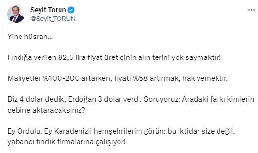 CHP Ordu Milletvekili Seyit Torun da, açıklanan fındık fiyatına sosyal medya hesabından sert tepki gösterdi.