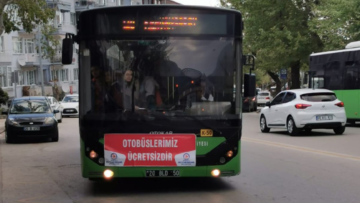 Denizli Büyükşehir Belediyesi Ulaşım A.Ş.’ye ait otobüsler bugün önlerinde ‘otobüslerimiz ücretsizdir’ yazısıyla sefer yaptı.