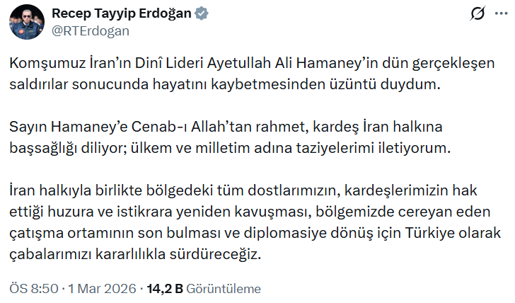 Erdoğan mesajında, Hamaney'in dün gerçekleşen saldırılar sonucunda yaşamını yitirmesinden üzüntü duyduğunu ifade etti.