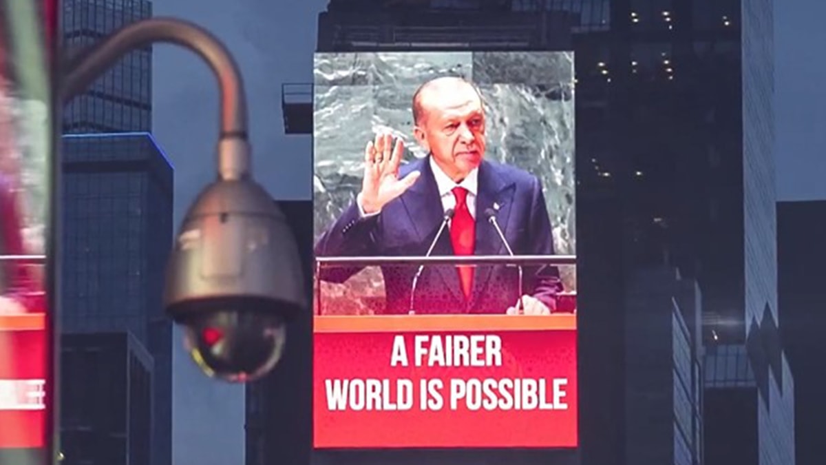 İletişim Başkanlığı, Cumhurbaşkanı Erdoğan’ın ‘Daha Adil Bir Dünya Mümkün’ sözünün New York’un Times Meydanı'ndaki led ekranlarda yer aldığını duyurdu.