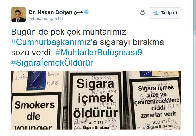 Bazı muhtarların üzerlerine isimlerini ve o günün tarihini yazdıkları sigara paketlerinin fotoğraflarını Twitter üzerinden paylaştı. Erdoğan'ın kaç muhtardan bu şekilde imzalı sigara paketi aldığı ise belirtilmedi.
