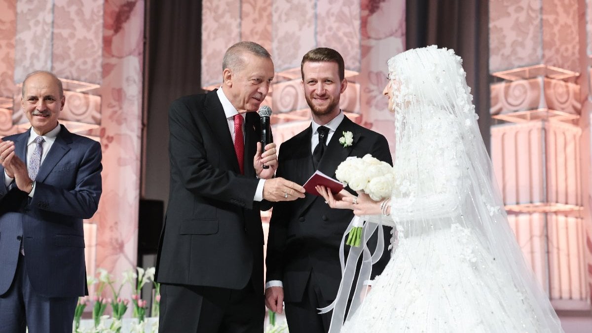 Nikah şahitliği yapan Erdoğan çifti tebrik ederken, evlilik cüzdanını geline verdi.