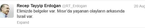 Başbakan Recep Tayyip Erdoğan’ın “Elimizde belgeler var. Mısır’da yaşanan olayların arkasında İsrail var” sözlerinin hemen ardından Beyaz Saray’dan gelen kınama üzerine Anadolu Ajansı’nın Erdoğan’ın bu sözüne ilişkin haberini iptal etmesi, bizzat Başbakan Erdoğan’ın kişisel twitter hesabından verdiği aynı mesajın akıbetini akıllara getirdi.CHP Genel Başkan Yardımcısı Umut Oran, Erdoğan’a, “Takipçileri arasında bakanlarınızın da bulunduğu @RT_Erdogan isimli hesap size mi ait? Bu adreste yer alan “Elimizde belgeler var. Mısır’da yaşanan olayların arkasında İsrail var” sözü size ait midir? Anadolu Ajansı haberi iptal ettiğine göre çelişkili durumu ortadan kaldırmak için bu tweet mesajını silecek misiniz? Yoksa bugün itibariyle bu mesajın arkasında mısınız?” diye sordu.
