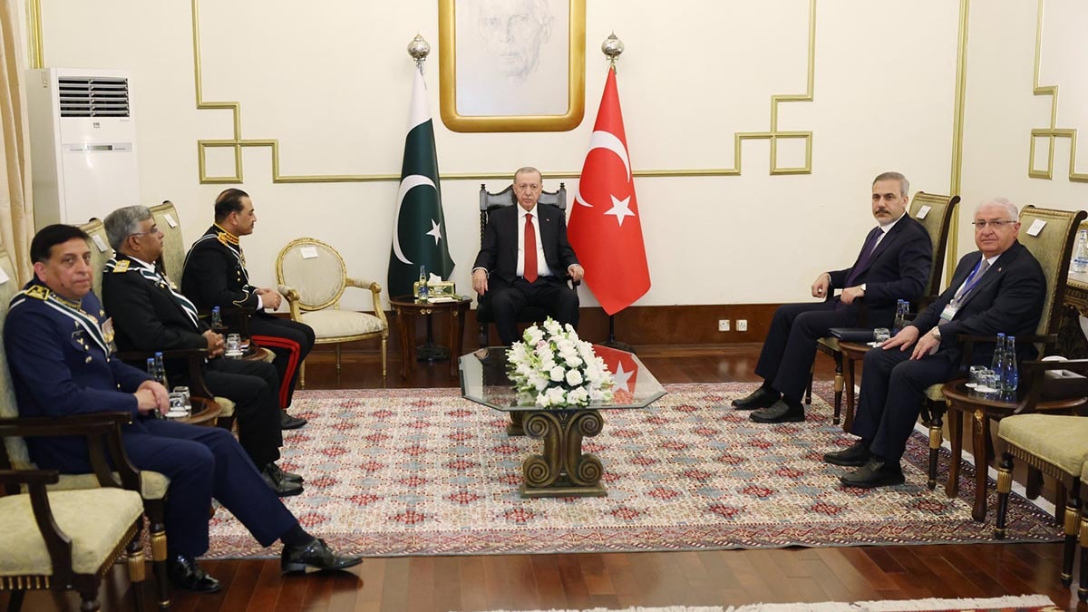 Cumhurbaşkanı Recep Tayyip Erdoğan, resmi temaslarda bulunmak üzere ziyaret ettiği Pakistan'ın başkenti İslamabad'da Pakistan kuvvet komutanlarını kabul etti. Görüşmeye, Türkiye Cumhuriyeti Dışişleri Bakanı Hakan Fidan ve Milli Savunma Bakanı Yaşar Güler de katıldı.