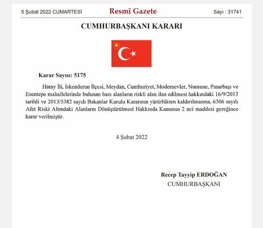 Depremde binlerce insanımızı kaybettiğimiz Hatay İskenderun’da afet riski altında alan ilan edilen bölge kararının tam bir yıl önce Cumhurbaşkanı Recep Tayyip Erdoğan tarafından kaldırıldığı kararname.