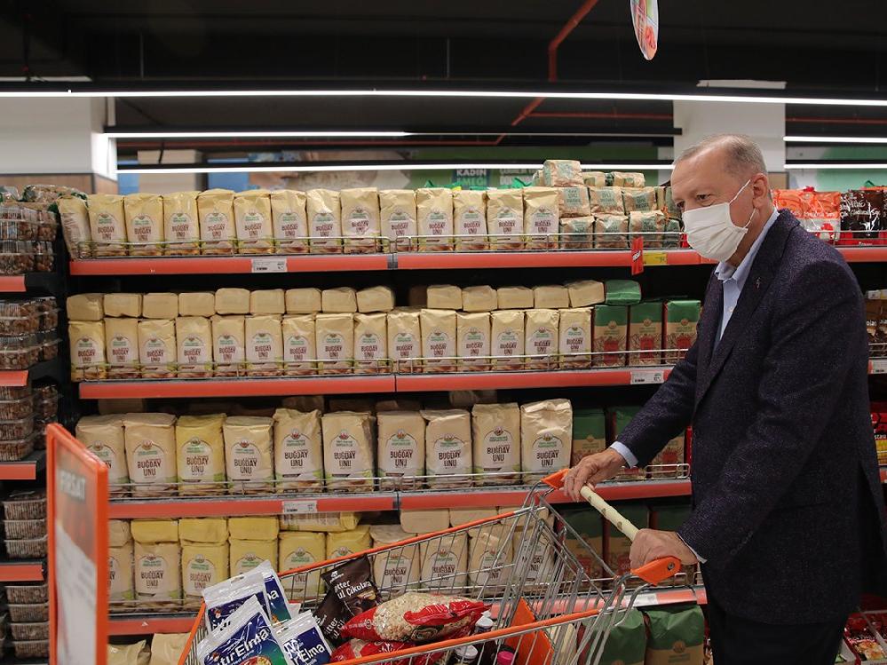 Ürünleri inceleyip market arabasına koyan Cumhurbaşkanı Erdoğan, eşi Emine Erdoğan ve Sümeyye Erdoğan Bayraktar, mağazadaki vatandaşlarla sohbet etti.