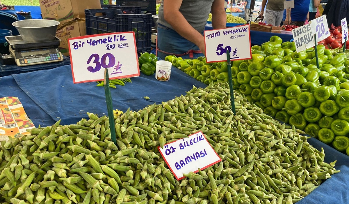 Tezgaha dizdiği bamyaya kilo fiyat yazmayan esnaf gramla satışa başladı. 200 gram bamyayı 'bir yemeklik' etiketiyle 30 liraya satan esnaf, 335 gramı ise 'tam yemeklik' etiketiyle 50 liraya tezgaha koydu.