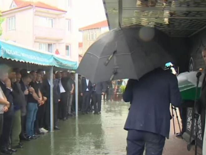 Namaz sonrası tabutun yanına geçerek Fatiha okuyan Cumhurbaşkanı Erdoğan, aniden bastıran yağmur yüzünden dakikalarca yerinden kıpırdayamadı. Koruma ekibi şemsiye getirmesine rağmen Erdoğan, üstü kapalı olan musalla taşının yanında beklemeyi tercih etti.
