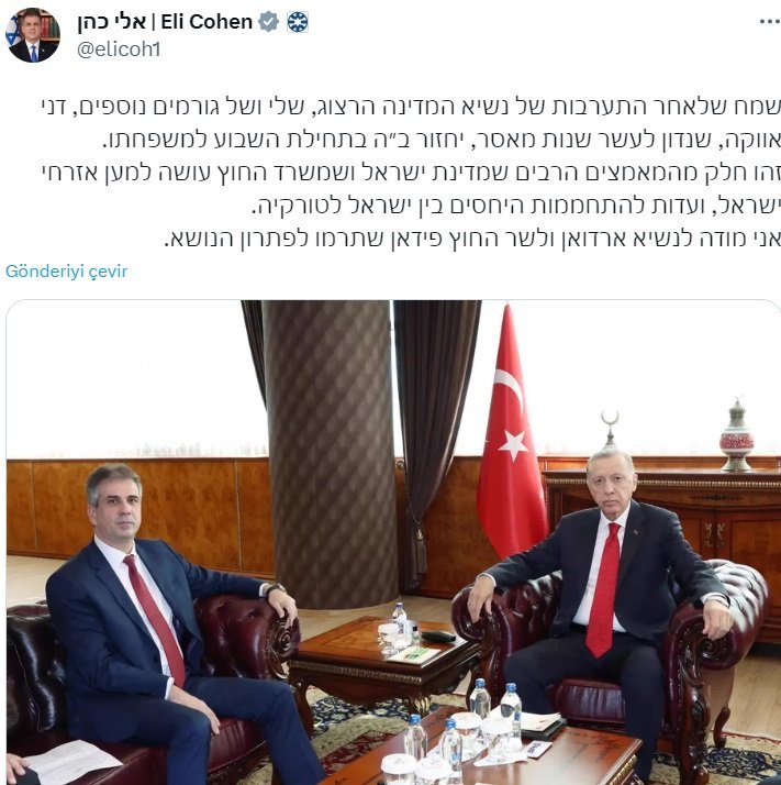 Sosyal medya platformu X üzerinden açıklamada bulunan Cohen, “Ne mutlu ki Başkan Herzog’un, benim ve diğer yetkililerin araya girmesinden sonra 10 yıl hapis cezasına çarptırılan Danny Awka hafta başında ailesinin yanına dönecek. Bu, İsrail Devleti ve Dışişleri Bakanlığı’nın İsrail vatandaşları için yaptığı birçok çabanın bir parçası ve İsrail ile Türkiye arasındaki yakınlaşmanın kanıtıdır. Sorunun çözümüne katkı sağlayan Cumhurbaşkanı Erdoğan ve Dışişleri Bakanı Fidan’a teşekkür ediyorum” ifadelerini kullanmıştı.