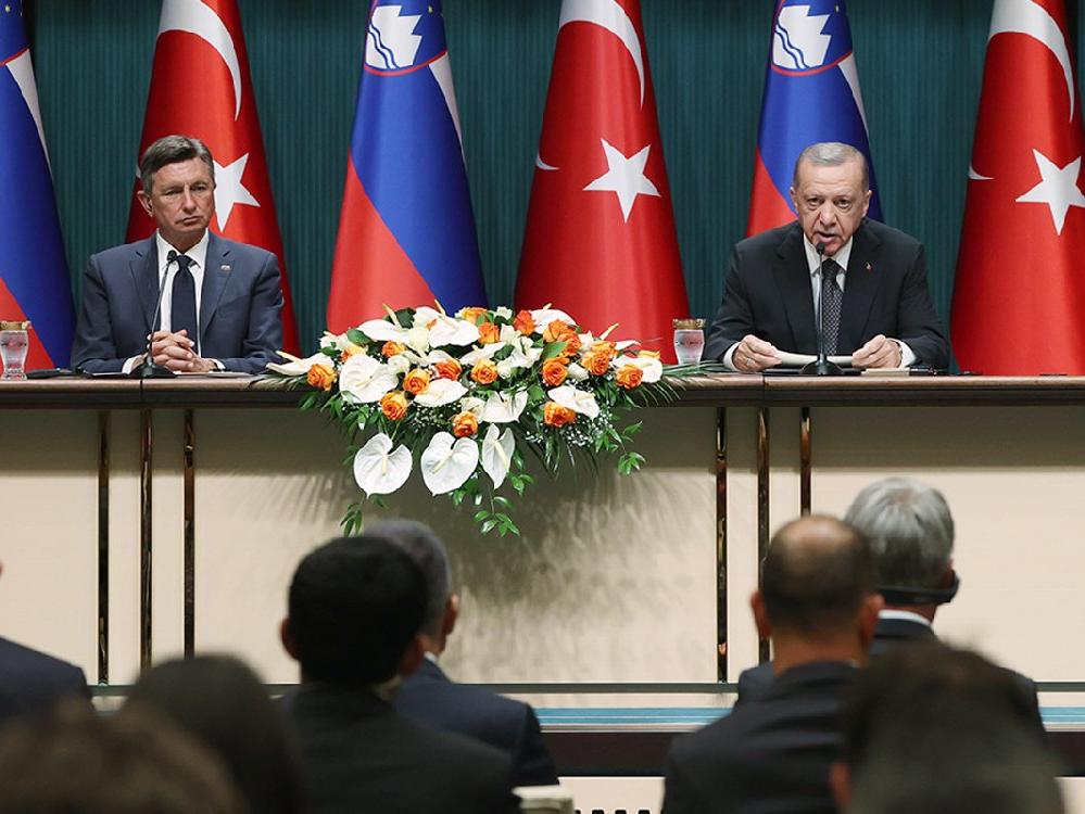 Görüşme sonrası iki lider ortak basın toplantısı düzenledi. Slovenya Cumhurbaşkanı Pahor ile son olarak Mart 2021'de Antalya Diplomasi Forumu'nda bir araya geldiklerini ve kapsamlı bir görüşme gerçekleştirdiklerini anımsatan Erdoğan, "Sayın Pahor, 15 Temmuz hain darbe girişiminin ertesinde Türkiye'yi ziyaret eden ilk Avrupa Birliği ülkesi lideri olmuştu. Dayanışmasını göstererek stratejik ortaklığımızın gereğini yapmıştır. Kendilerine samimi dostlukları ve destekleri için bir kez daha teşekkür ediyorum. Sayın Pahor, dün 13. Büyükelçiler Konferansı'na katılarak hitapta bulundu. Değerli tecrübe ve görüşlerini büyükelçilerimizle paylaşmış oldu." dedi.